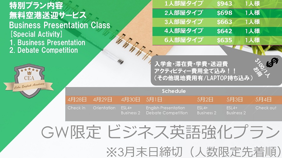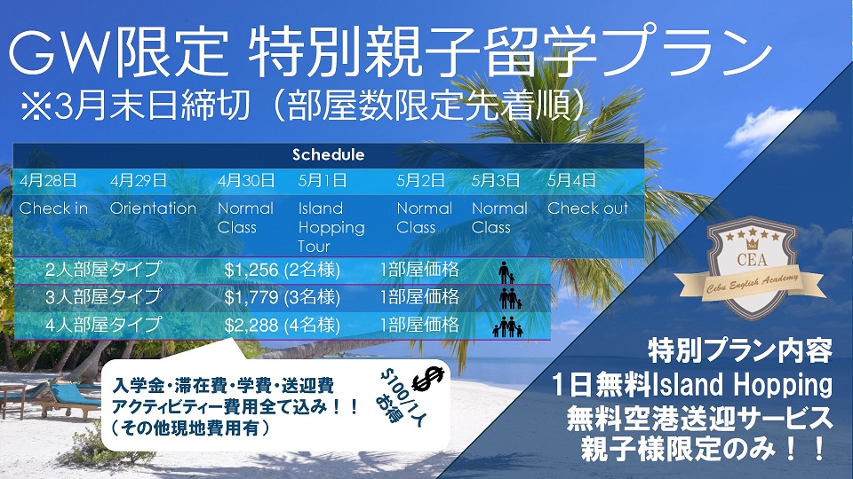 1.親子留学プラン(無料Island Hopping等特典付き)