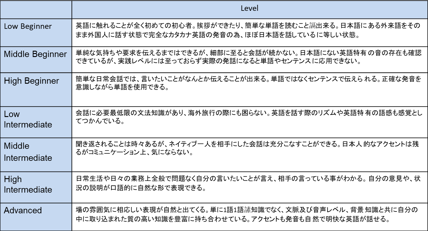 ・すべての学生はそれぞれ違った英語力ですので、レベルテストの持つ意味は非常に重要です。英語力の正確な評価が学生個々の 英語教育及び、実力向上の基盤となります。初級~上級まで総7段階まで分けられたレベル䛿各8週の基本コースカリキュラムとして、 7段階課程をすべて修了後には、自分の意思表現を自由自在に表現できる高い水準の英語能力を備えることになるでしょう。