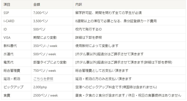 ※例えば12週間の留学の場合、更新回数が2回となりますので3,440 + 4,710 = 8,150ペソが必要となります